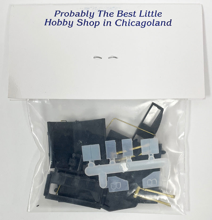 Plastic EMD GP9/ GP18/ GP20 low nose conversion kit. Includes low hood nose, top and sides. Windshield piece and number boards with headlights. Also include brass stanchions and wire handrails. Fits AM GP