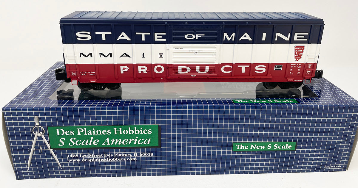 S Scale America S Scale 50' PS5344 Cuft Boxcar. Equipped with Hi-rail wheels and couplers. Scale wheels included in the box. Etched metal crosswalks and metal grab irons. Maine,Montreal & Atlantic. Red, White and Blue car.